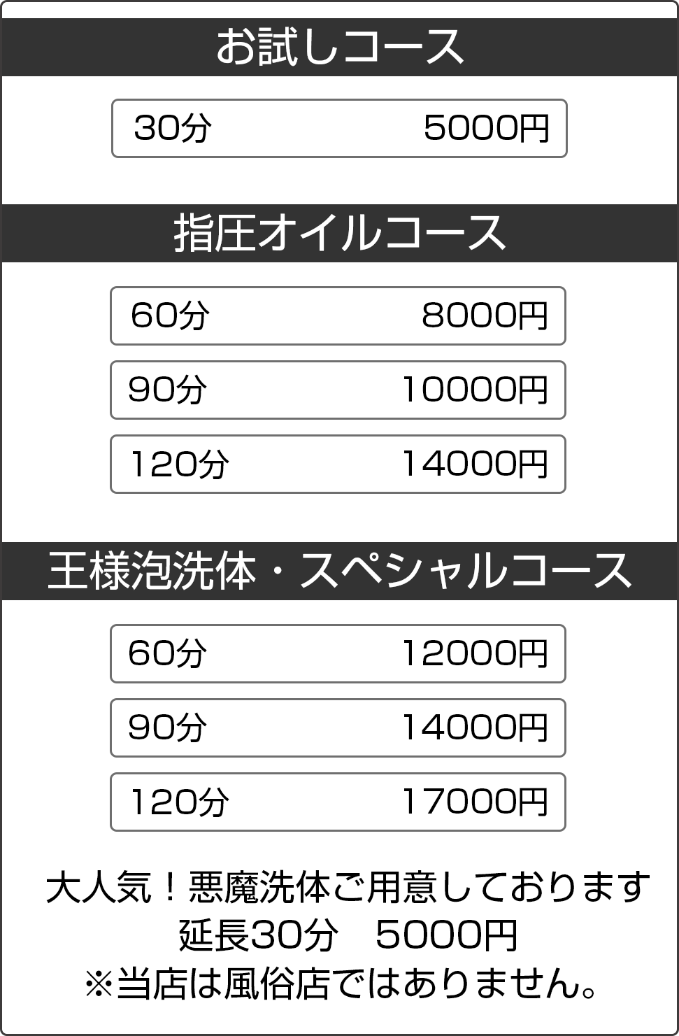 | その他 | 当サロンは風俗店ではございません。 また、回春などのサービスも一切ありません。 |